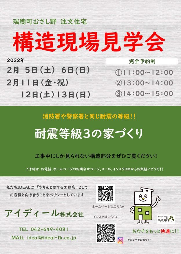 完成してからでは見られない、 耐震等級3の構造体をご見学できます!