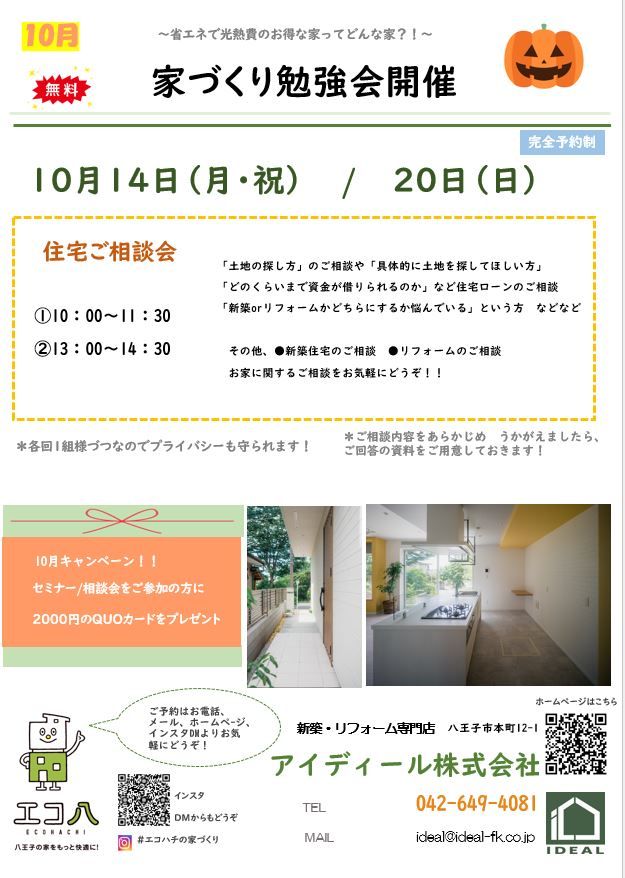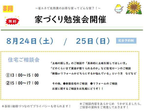 住宅ご相談会【完全予約制】 ➀13:00~15:00 ②15:00~17:00