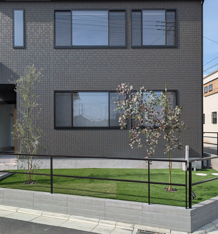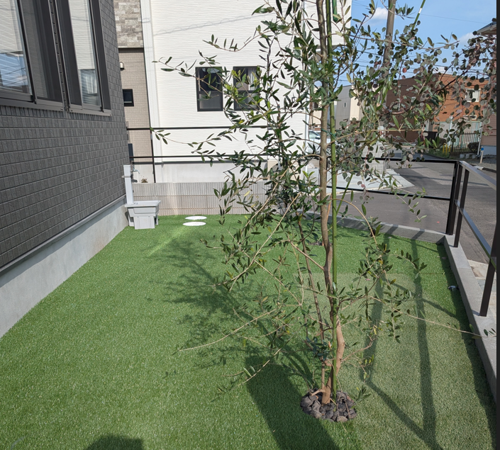 人工芝と植栽はオリーブとユーカリポポラスを植えました