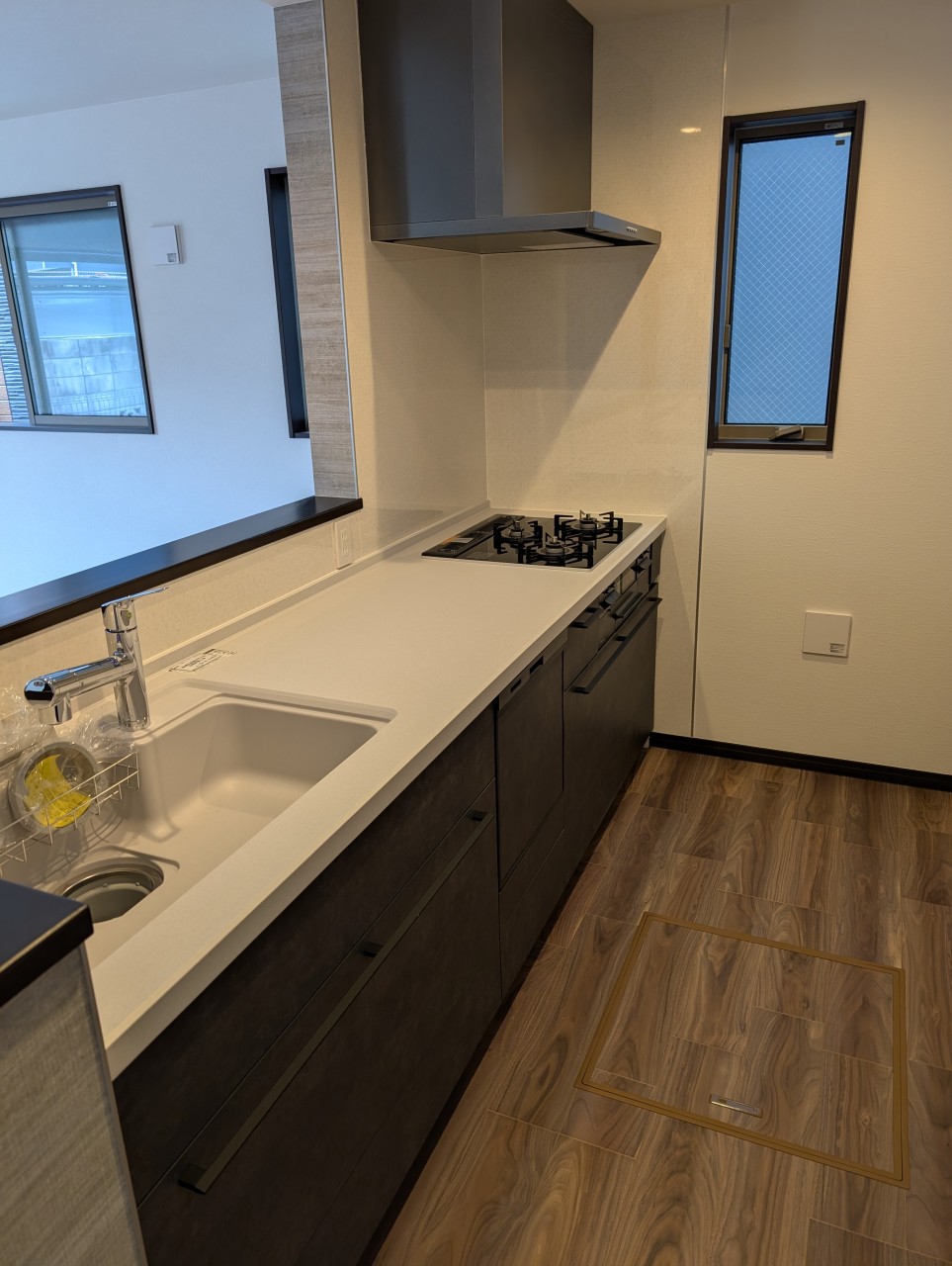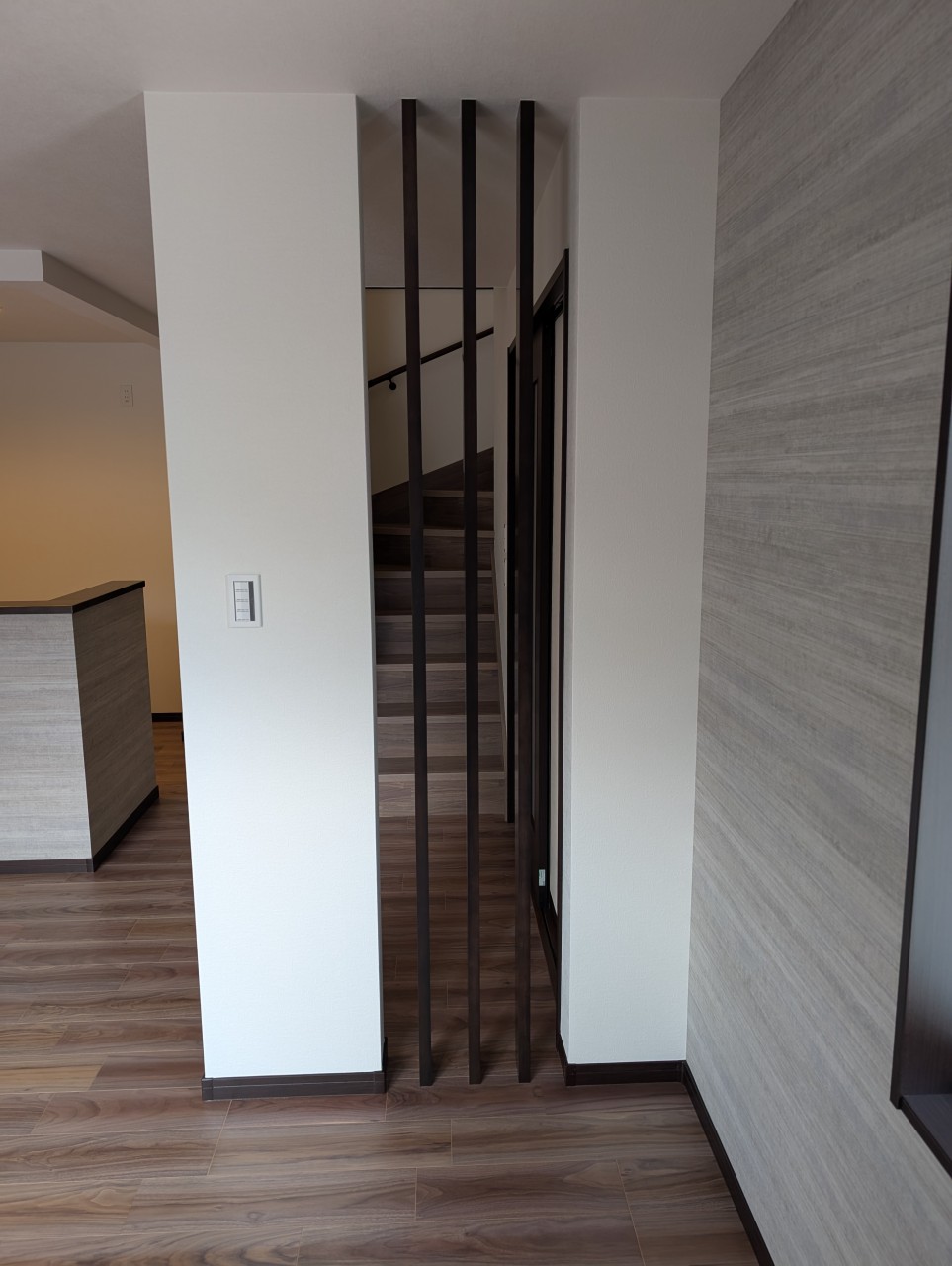 リビングとキッチンにグレーのアクセントクロスがおしゃれです