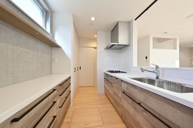 木目調のキッチンの背面、カップボード側や木目調の洗面カウンターの壁にアクセント使いでグレーを入れたり、