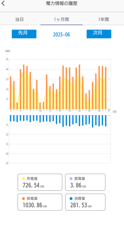 梅雨時期でも雨が少なかったので、しっかり発電して買う電気(買電量)は3.86kwhとかなり少なくすみました。