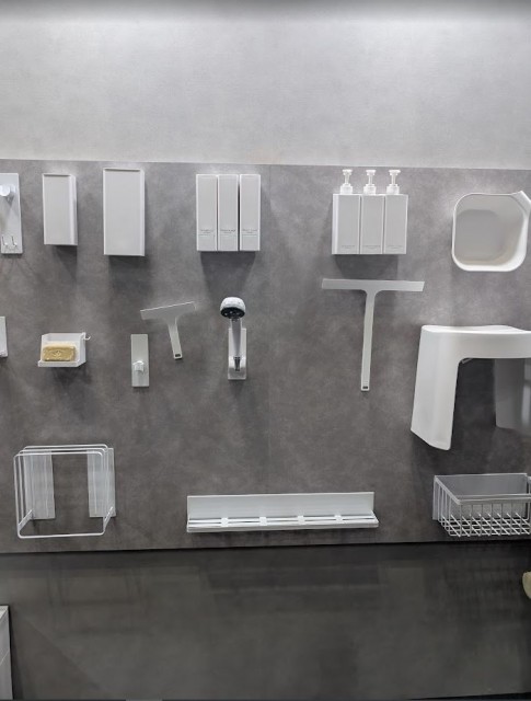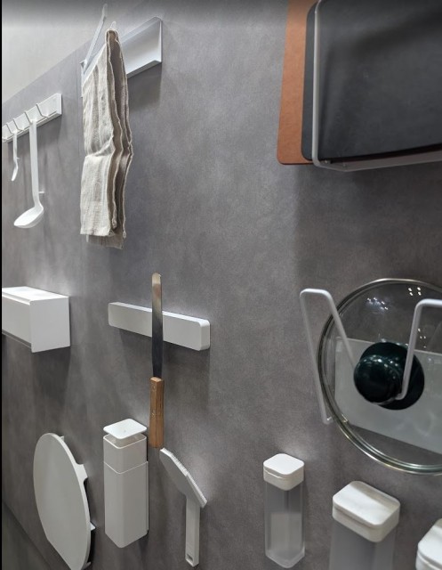 昨日の展示会で見た中にも、最初の写真と同シリーズで、キッチンアイテムからお風呂アイテムまでマグネットで壁掛け可能なものが色々出ています。(お風呂のイスまで壁にくっつけられるなんて素敵ですよね!)