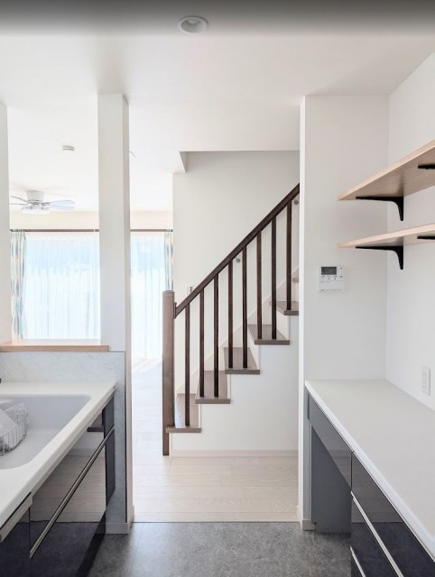 格子の階段手摺、いい感じですよね! 手すりのお話は「また今度!」として、今日のブログは「キッチンの床を水回りに強いフロアにするのが人気です!」というお話です。