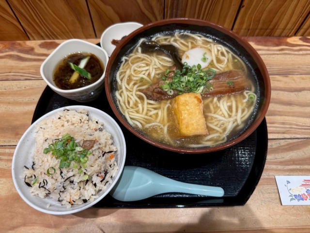 息子さんが頼んだメニュー、ソーキそばと沖縄の炊き込みご飯、ジューシーのセット、とっても美味しそう♫