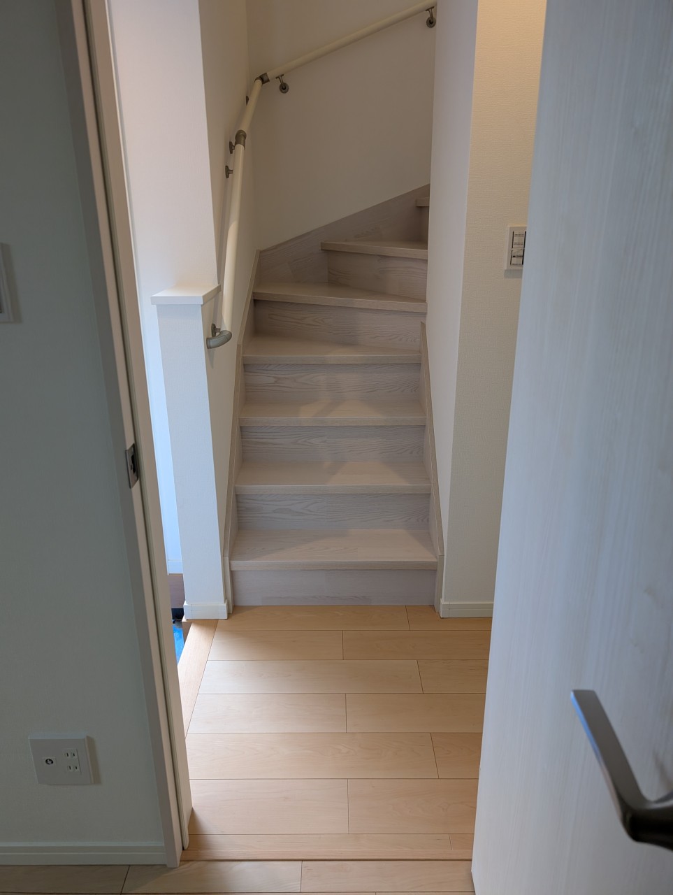 階段はホワイトアッシュ色、フロア色と変えてアクセントに