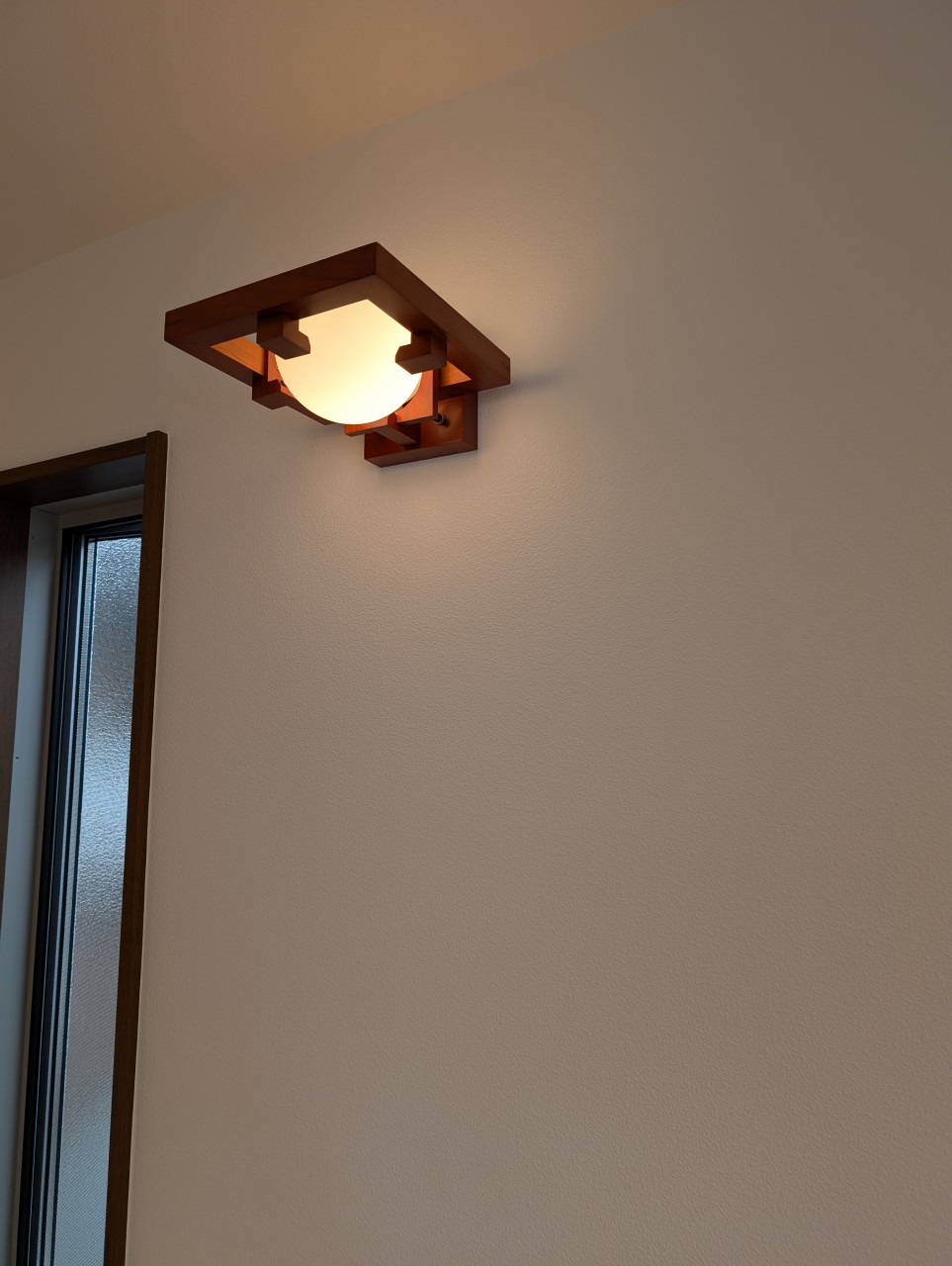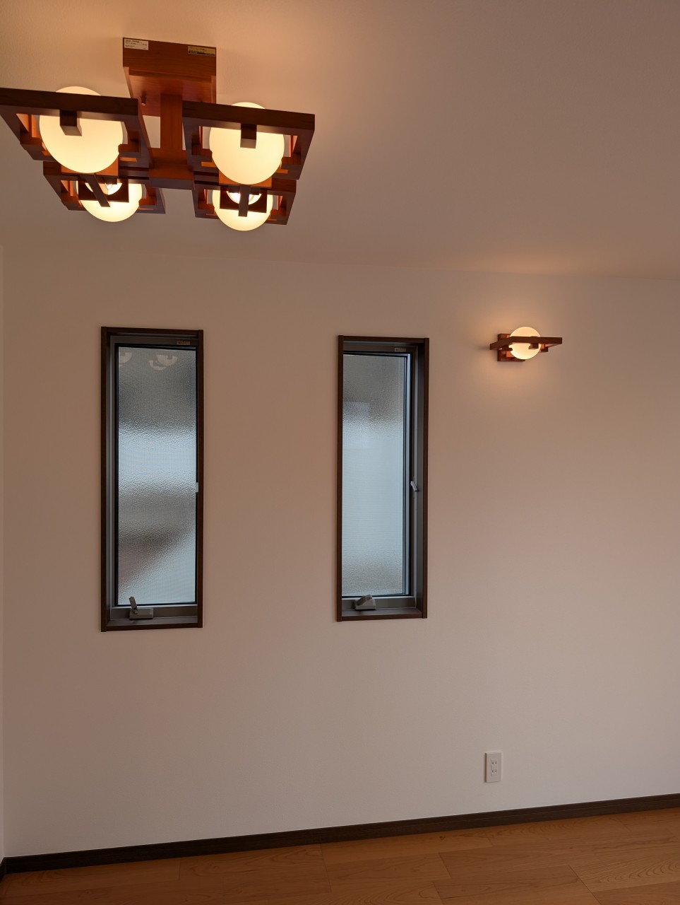 建築家のフランク・ロイド・ライトがデザインした木とガラスのブラケットライトとシーリングライト、ブラックチェリーのフロアとも良く合います。