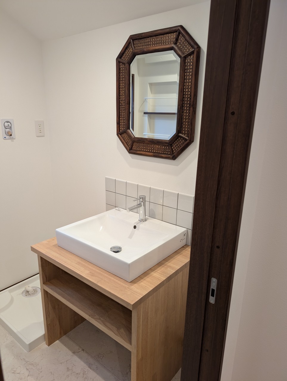 壁はリクシルのホワイトタイルにグレー色の目地にしました。