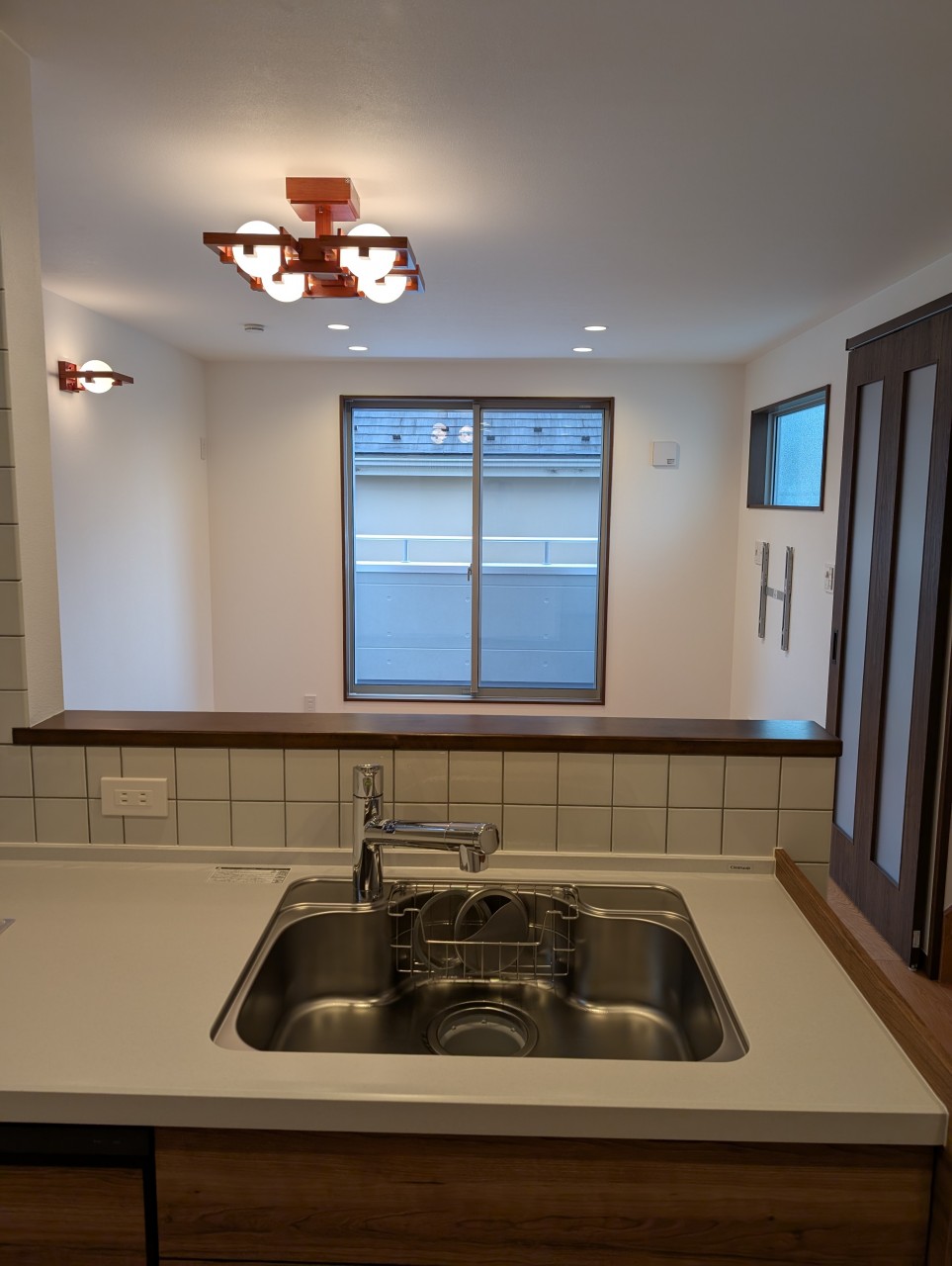 タイル張りがオシャレなキッチンと素敵な照明器具があるリビング・ダイニング