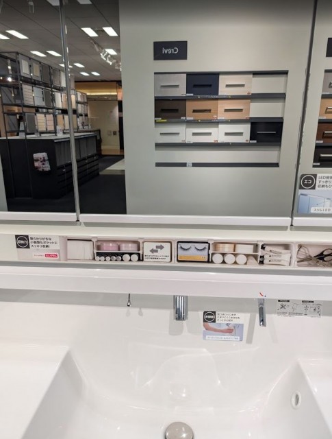 注文住宅で使うことの多い、洗面化粧台の便利な収納機能を実際に見て触って、