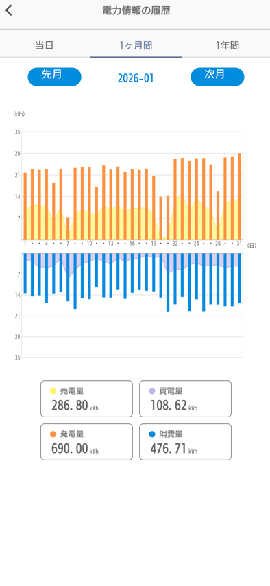1月は晴れの日が続いたので10月・11月と同じくらい発電しました。