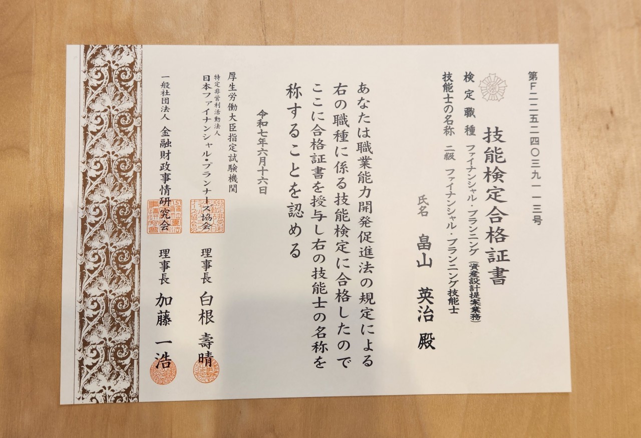 2級ファイナンシャル・プランニングの試験に無事合格をしました。