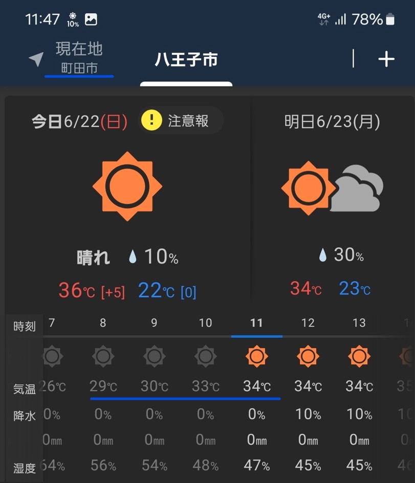参考までに、本日の11時47分の町田市の外気温ですが、34度近くありました。