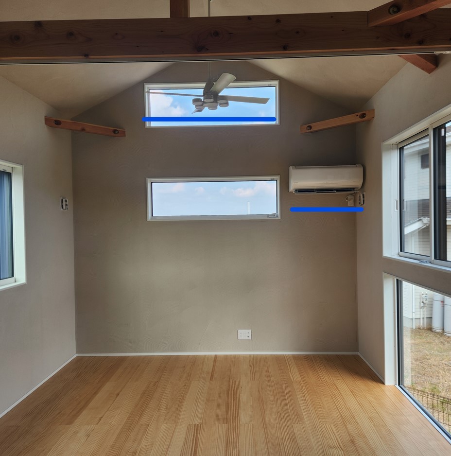 2階のリビングにあるエアコンとシーリングファンの運転開始。