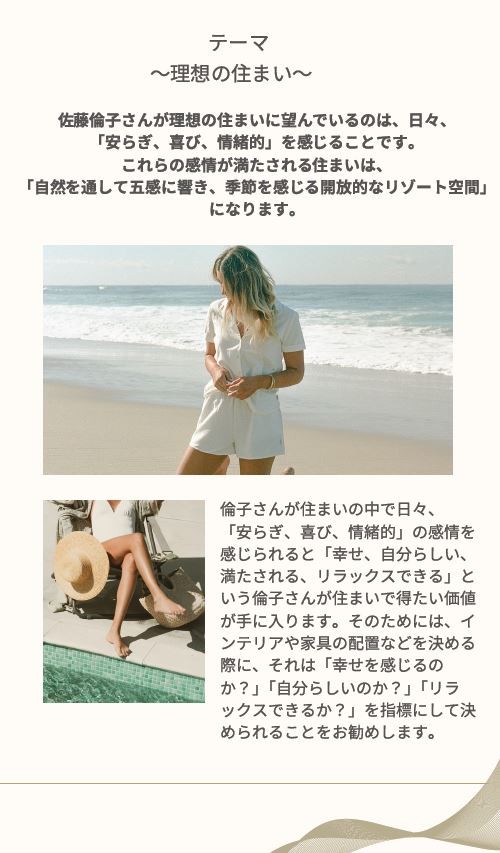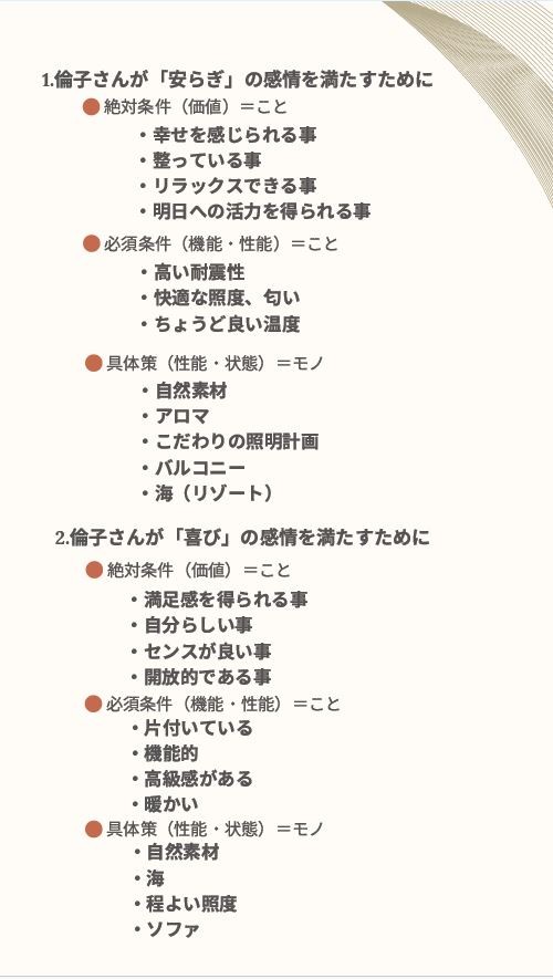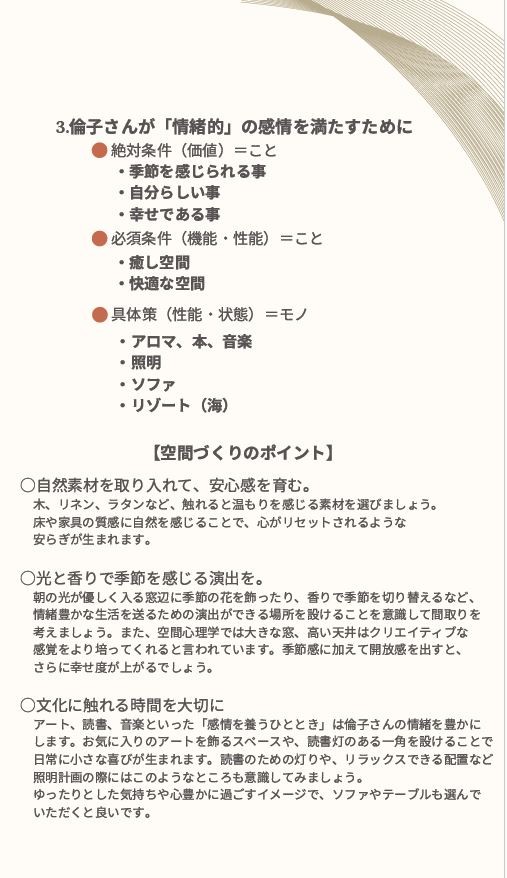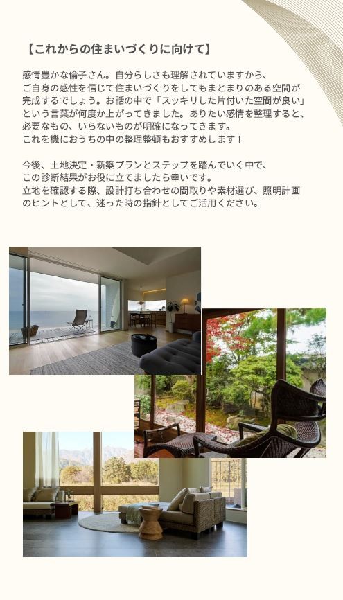 そして下のように、何をどうして望んでいて、その空間を実現化することによりどんな効果をもたらしてくれるのかを示した診断書を出してもらえます。