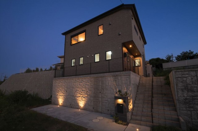 室内だけでなく、外部の駐車場スペースも照明を配置していますので、夜間も素敵にライトアップされます。