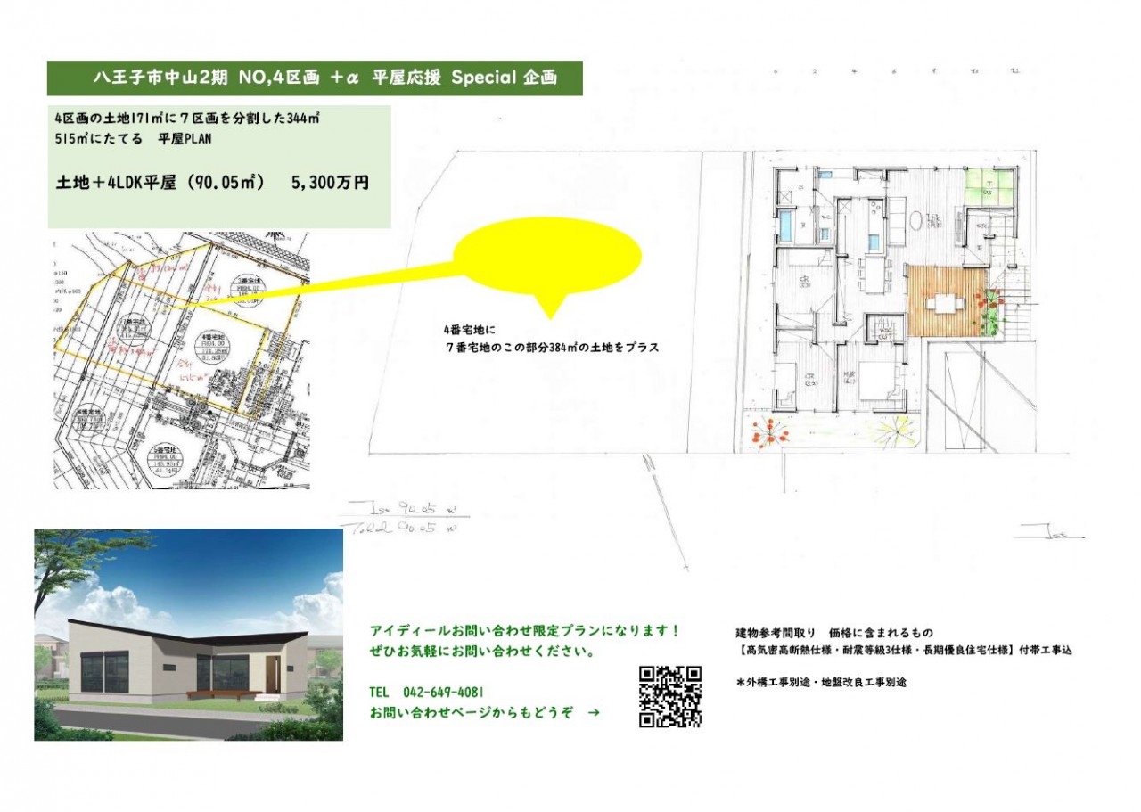アイディールの分譲地、八王子市中山のNO,3とNO,4にて平屋応援キャンペーン中です。