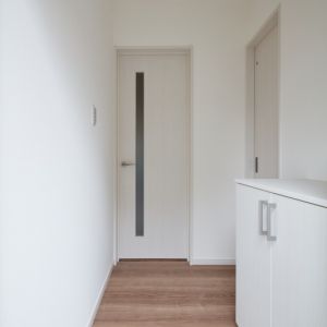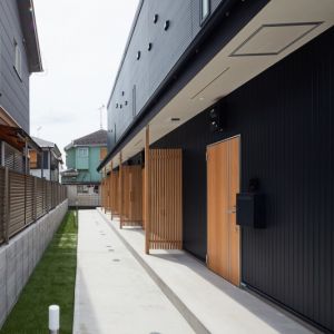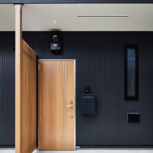 ブラックの外壁に隣の部屋とのパーテーションの格子と玄関ドアの木目調が和モダンの雰囲気をつくりだしています!