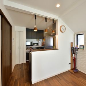 キッチンの手元灯を兼ねたペンダントライトがインテリアのアクセントに