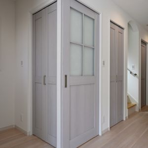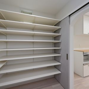 大容量のストックができるパントリーは扉付きで隠せる収納スペース
