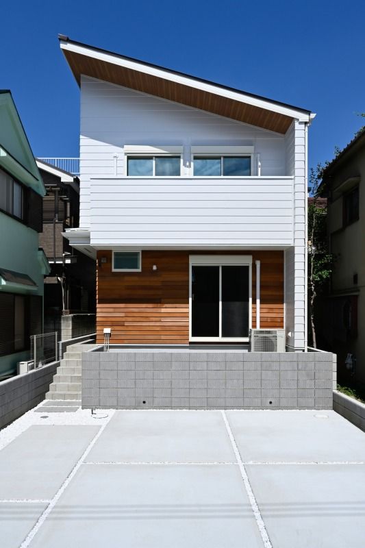 ホワイトのガルバリウムにリアルな木製の外装材の組み合わせがおしゃれな外観