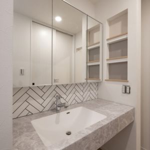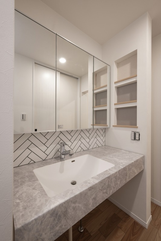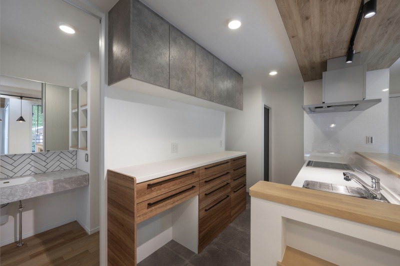 ホールに設置した洗面ペース。下がオープンなので椅子を置けばゆっくりメイクもできちゃう