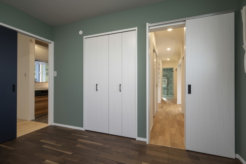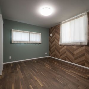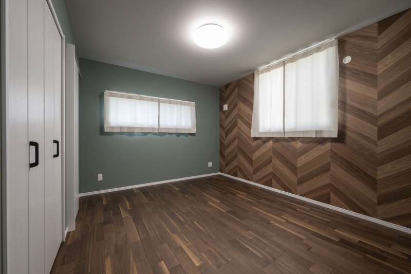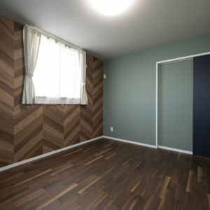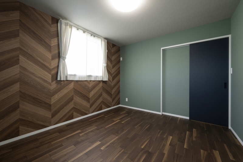 木目調&グリーンの壁紙がお気に入りの主寝室