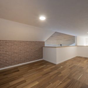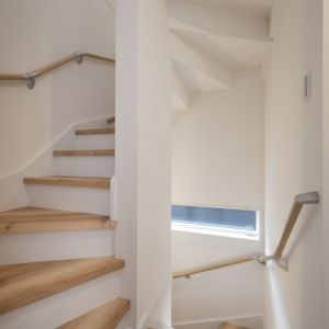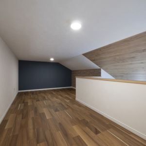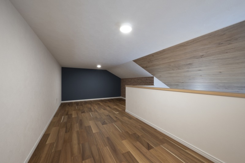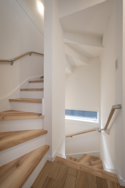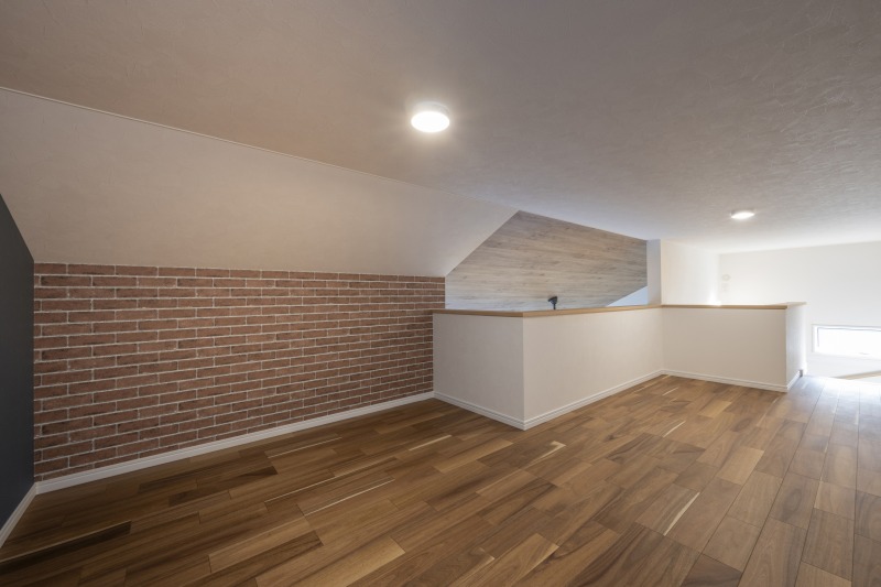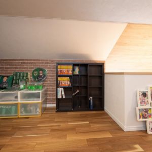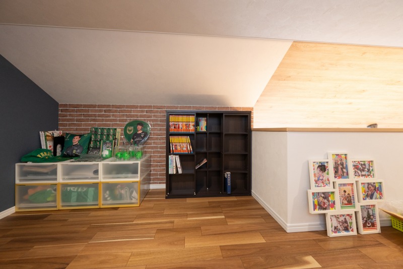 階段横には収納スペースもあり。2階に上るとファミリーの空間が広がっています