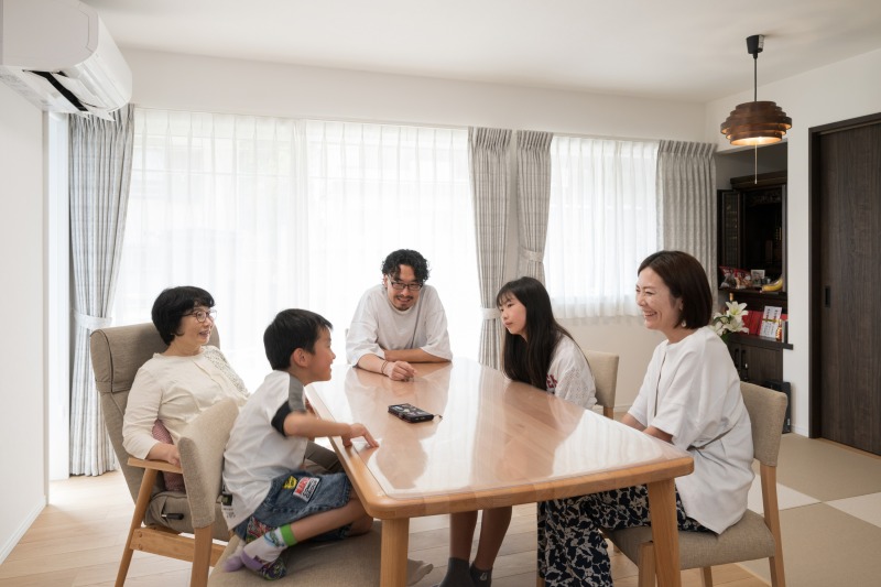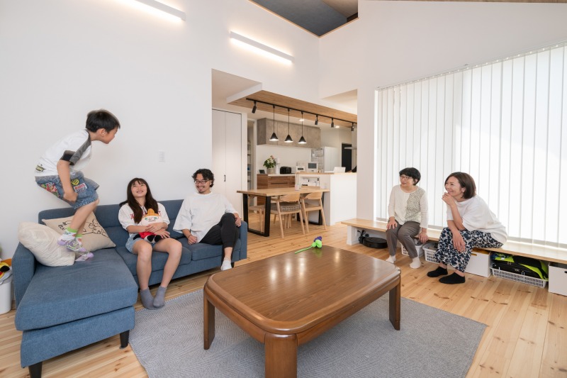 会話も弾むリビング。ベランダ入口には収納もできるベンチを設置しました