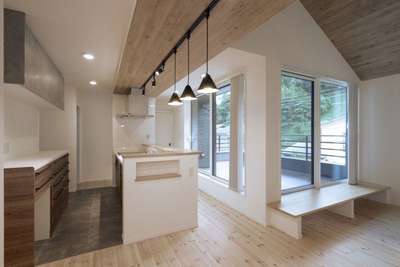 低い位置にセッティングされたペンダントライトでより一層明るい雰囲気に