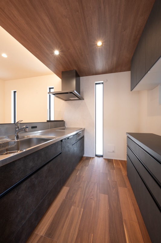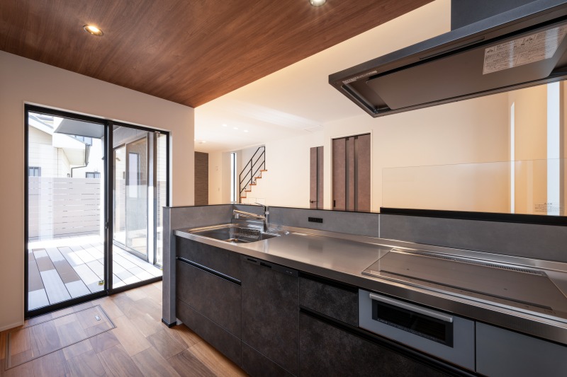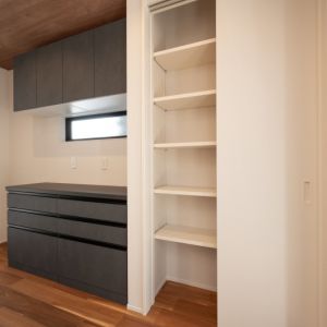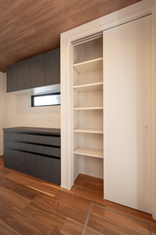 キッチンと同色で揃えた食器棚はたっぷり食器が入ります