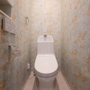 ブルーの壁紙で落ち着いた雰囲気にした寝室