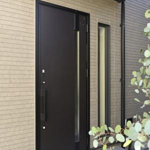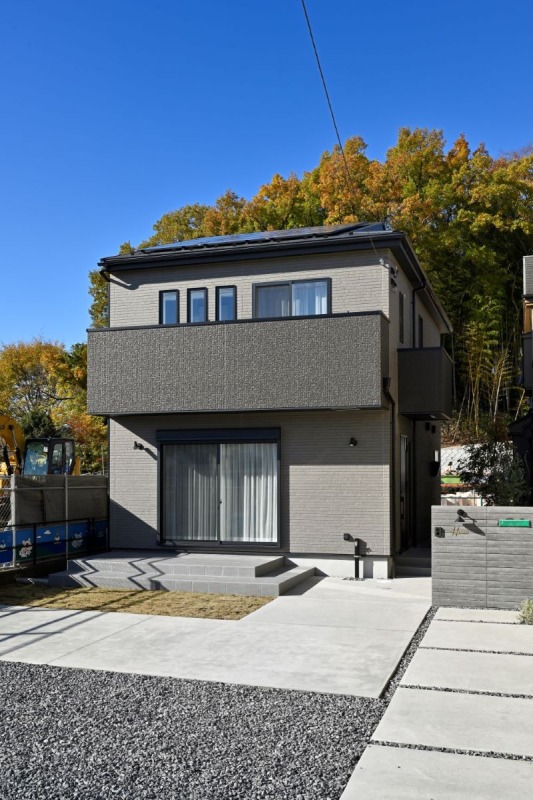 庭先広々の玄関前。グレーの外壁が落ち着いた雰囲気を醸し出しています