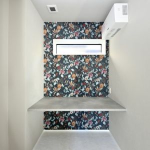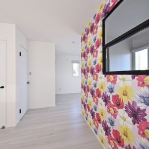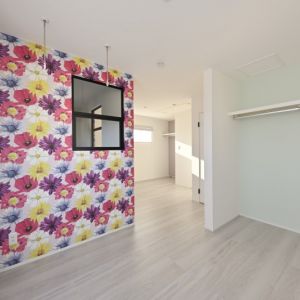 子供部屋に設置された吹抜け窓がワクワク度をアップ!クロスも元気がでるフラワー柄