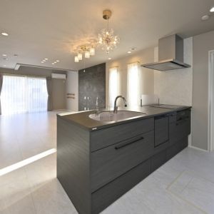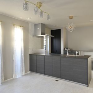 照明の器具や位置もバッチリ ペニンシュラ型のキッチンは天板の人造大理石が美しいトクラス製