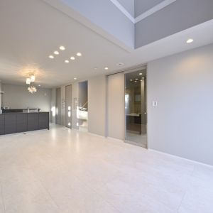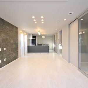 白い石目調の床に薄いグレーのクロスが上品なLDK タイル仕上げの壁はTVスペース