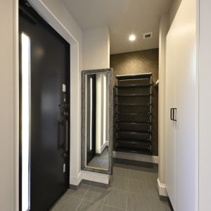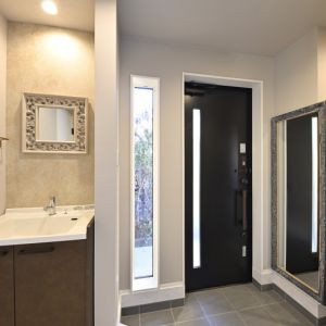 玄関の左側に手洗器 玄関からシックなテイストでまとまっています