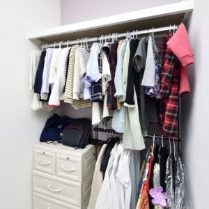 子供部屋用クローゼット例 扉はなし 背面はカーテンと色合わせしたかわいいパープル色