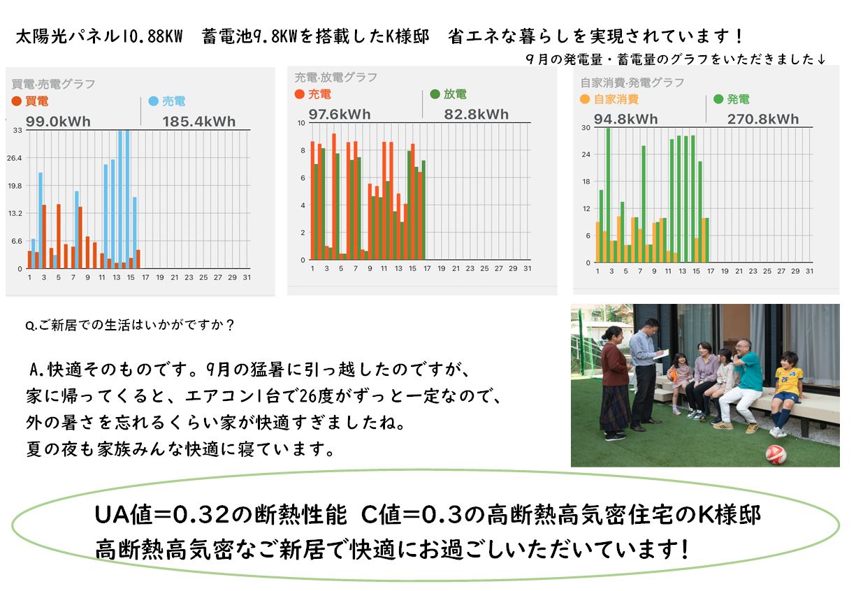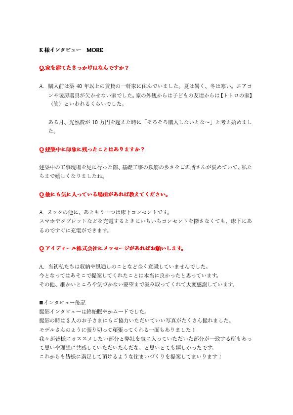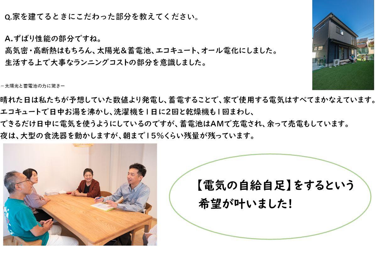 A,ホームページのトップにも書いてある【自由設計で高気密高断熱な家】という部分に一番の魅力を感じました。以前住んでいた家の光熱費がとても高かったので・高断熱という部分で快適に住み続けられる且つ、ランニングコストが抑えられるのではないかという思いがあり、アイディールさんにお願いをしました。