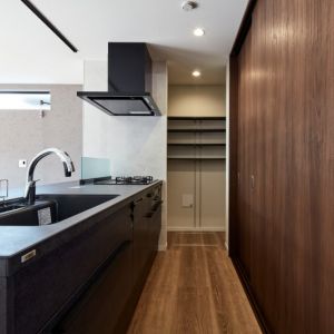 キッチンの背面の扉は食器棚&家電スーペース、キッチン奥にはパントリーで収納たっぷり