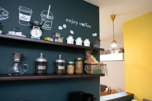 グレーと木目調の内装がおしゃれな空間づくりを演出しています
