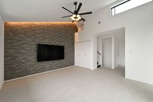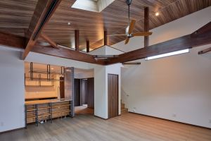 勾配天井や壁の仕上げが高級感のあるLDKの家