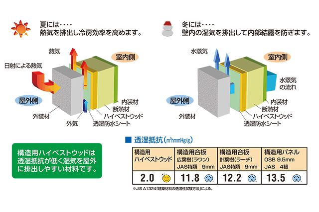 通気工法は、外装材との間に適切な通気層を設けることで、内部結露により壁内に生じた湿気をすみやかに屋外に排出させるものです。構造用ハイベストウッドは、他の面材と比較して透湿抵抗が低く、壁内の湿気をスムーズに排出して、住宅の耐久性を高めます。
