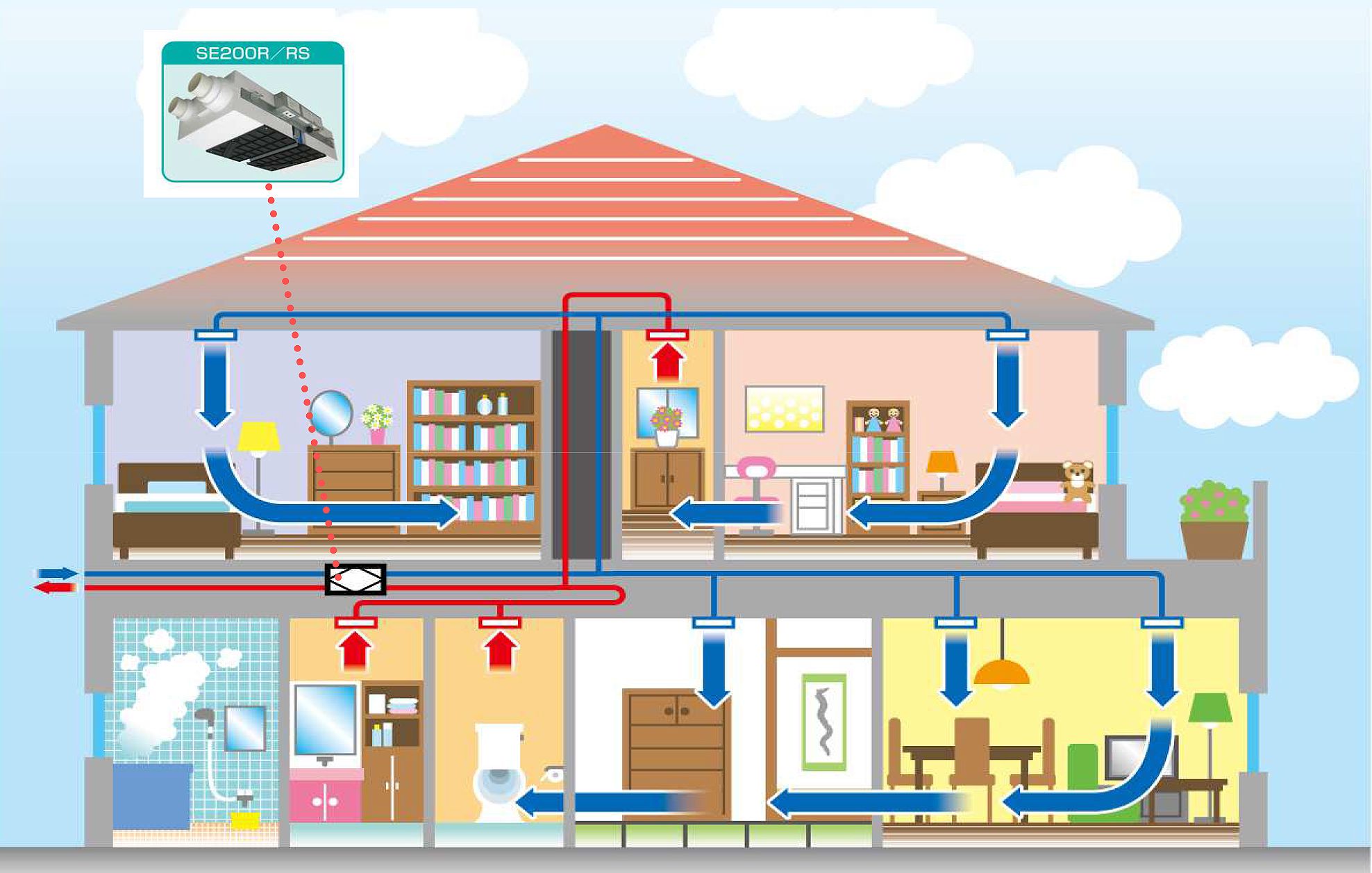 リビングや寝室には新鮮な空気を24時間供給します。トイレや洗面所の空気は常時排気し、嫌な臭いや湿気は残しません。